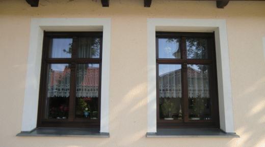 Fenster und Hauseingangstür aus Meranti gefertigt und in Nussbaum lasiert.